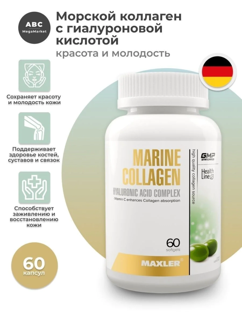 БАД Maxler "Марин коллаген Гиалуроник эсид комплекс", 60 капсул для кожи, волос, ногтей и суставов