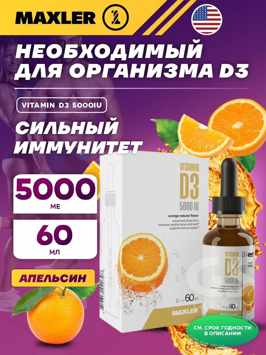 БАД Maxler Витамин D3 5000 IU вкус апельсина жидкость, 60 мл для костей, зубов, суставов и иммунитета