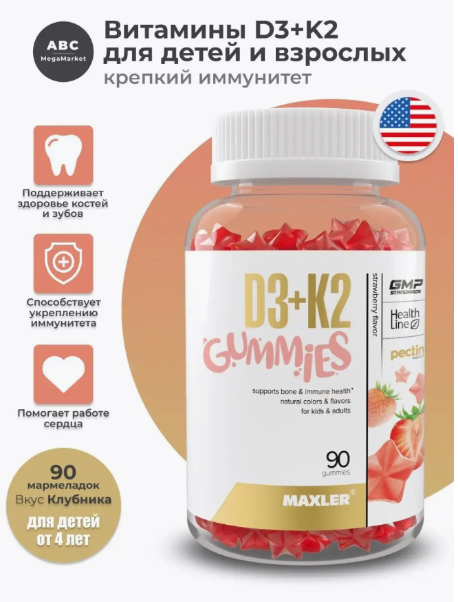 Maxler Кальций D3 Gummies жевательные пастилки со вкусом клубники, 90 шт – здоровье костей, зубов и иммунитета.