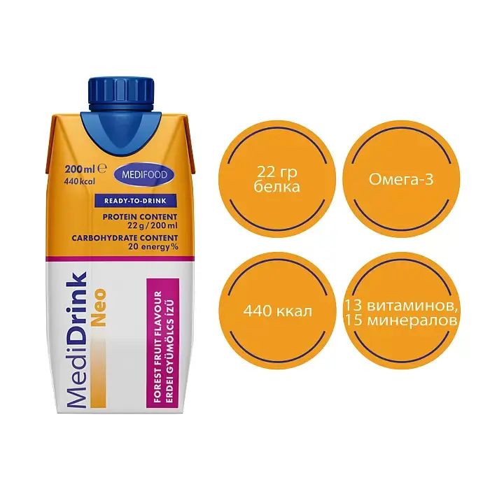 Специализированный продукт MediDrink Neo для энтерального питания со вкусом лесных ягод создан на основе научных исследований, современных технологий и заботы о выздоровлении пациентов.