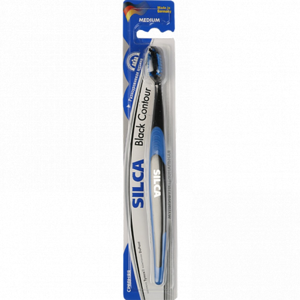 SILCA Black Contour – многофункциональная зубная щетка с инновационной головкой, снабженной двухуровневой щетиной с высоким внешним рядом и силовым выступом. Двухуровневая щетина отвечает за эффективную очистку как жевательных поверхностей, так и межзубных пространств (причем высокий внешний ряд щетинок позволяет одновременно очищать и внешнюю, и внутреннюю поверхность зубов, а силовой выступ интенсивно очищает труднодоступные места). Фактурные вставки из мягкого пластика на ручке предотвращают скольжение щетки во время чистки.