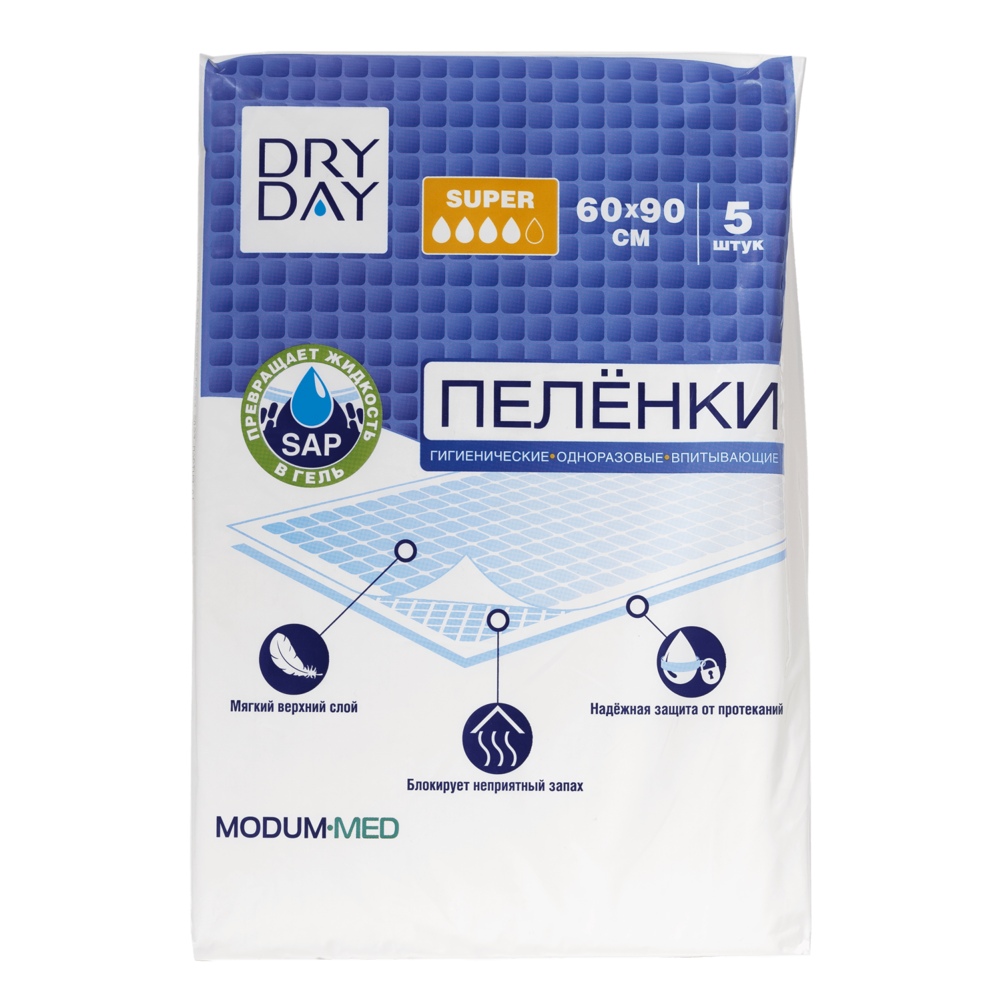 Пеленка гигиенические одноразовые впитывающие Dry Day Super 60 x 90 см, 5 шт