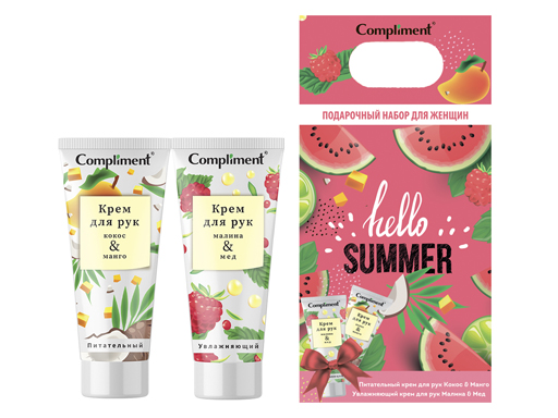 Питательный крем для рук Compliment с маслом кокоса и маслом манго, 75 мл; влажняющий крем для рук Compliment с экстрактом малины и цветочным медом, 75 мл |